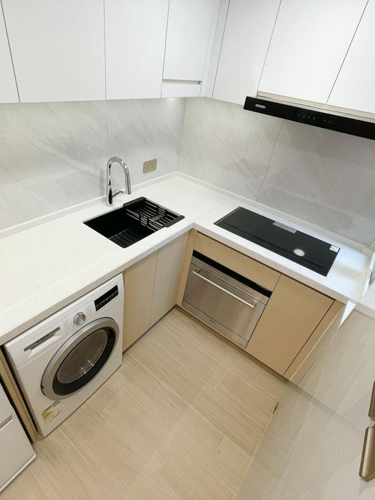 • 廚房設計亮點:全隱藏式收納系統,櫃面利落乾淨; 牆身選用大塊雲石紋磚,實用又易清潔